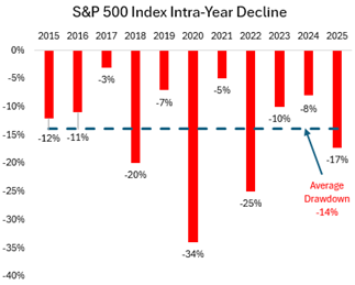 The average calendar year decline of the S&P 500 Index over the last ten years has been 14%, with three periods of 20% declines or more.  With a 17% decline for the S&P 500 from its peak, the current decline is deeper than average, but within the other three 20% drawdowns over the last decade. It is extremely difficult to accurately predict and position for a specific drawdown in any given year.  At a minimum, investors should consider setting their expectations that an equity market drawdown of 10-15% in any given year is possible, and plan accordingly.