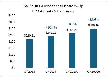 Based on the projections of economists in the Wall Street Journal Economic Forecasting Survey, U.S. real GDP is projected to reaccelerate in Q2 and continue to show growth into 2026. U.S. companies are also anticipated to benefit from a stable, growing U.S. economy. The aggregate estimated earnings per share (EPS) of companies in the S&P 500 Index are forecasted to grow this year and through 2026. In this environment, investors could continue to drive support for U.S. equities and other risk assets.