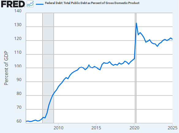 4 U.S. Office of Management and Budget and Federal Reserve Bank of St. Louis, Federal Debt: Total Public Debt as Percent of Gross Domestic Product [GFDEGDQ188S], retrieved from FRED, Federal Reserve Bank of St. Louis; https://fred.stlouisfed.org/series/GFDEGDQ188S, June 30, 2025.