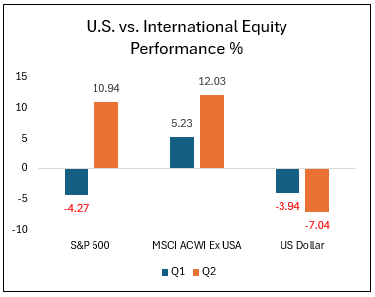 International equity markets have been strong this year. The MSCI ACWI ex USA Index, which measures both non-U.S. developed and emerging market companies’ stock performance, rallied 12.03% in Q2.1 Foreign currency