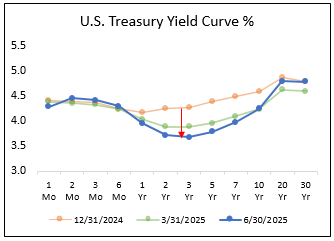 Interest rates were volatile across the yield curve in Q2, with yield shifts depending on the maturities of the bonds. Short-term rates will generally be dependent on the Fed’s monetary policy, while longer-term rates may be subject to bond investors’ views on the long-term trajectory of U.S. debt levels. This year, the biggest shifts in yields have been in the intermediate-maturity part of the yield curve, which is often tied to inflation expectations over the coming years.